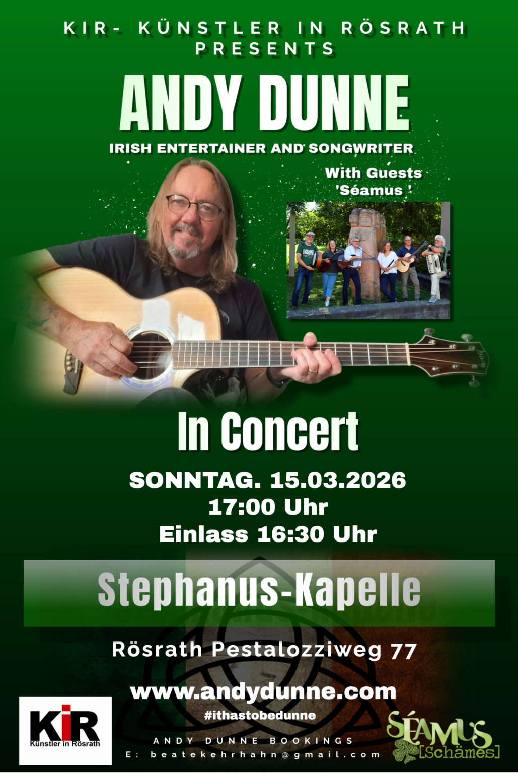 Im Vorprogramm spielt die Rösrather Gruppe Séamus, die auch zum Schluss des Konzertes einige Stücke mit Andy Dunne spielt.